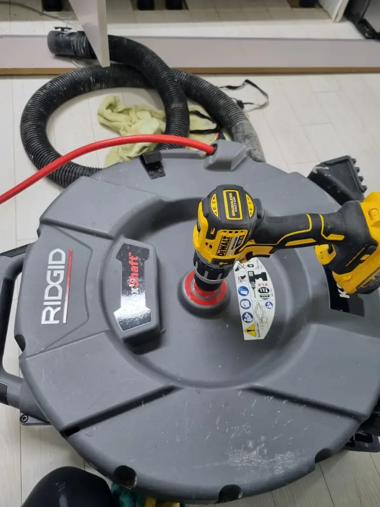 막힌 부분이 뚫리면 케이블이 부드럽게 더 깊이 들어가고, 물을 흘려보냈을 때 시원하게 빠지는 것을 확인할 수 있습니다. 작업이 끝나면 케이블을 천천히 빼내면서 배관 내벽에 붙은 찌꺼기도 함께 긁어냅니다.